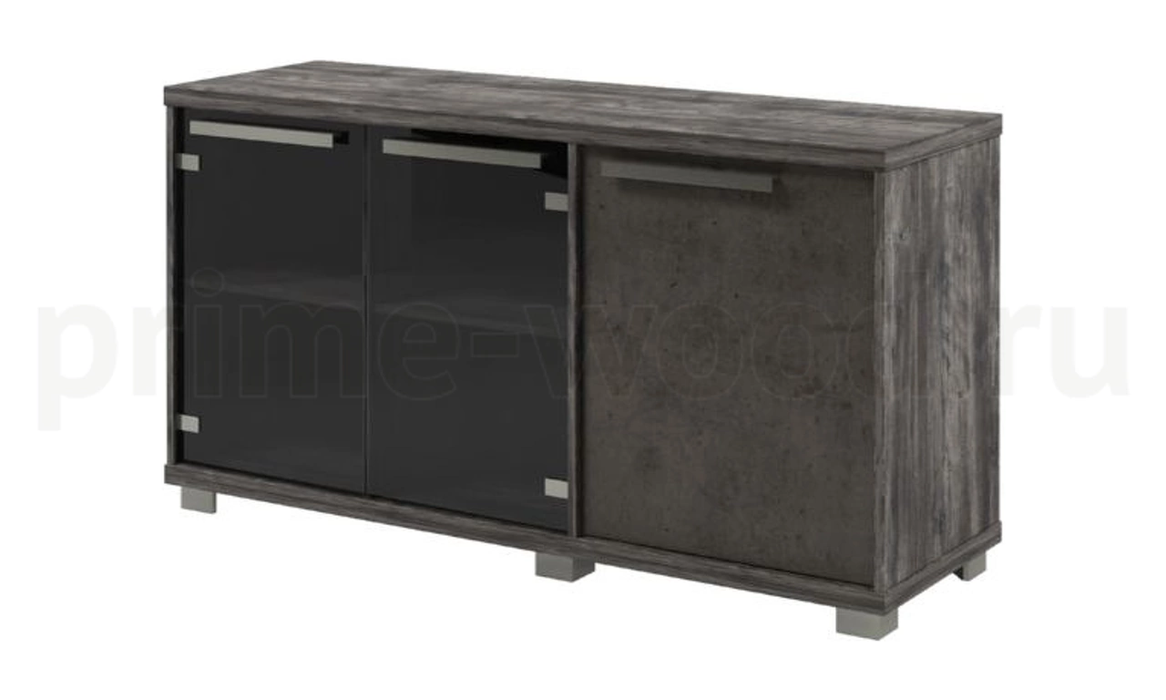 Шкаф низкий трехсекционный. Справа одна распашная дверь ЛДСП, слева две стеклянные двери. Внутри каждого отсека полка с возможностью установки на разную высоту.
